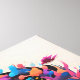 This vibrant, stylised image is a circular illustration set against a simple beige background. Within the circle, a half-moon glows with rich shades of yellow and orange. The moon is surrounded by a dynamic burst of abstract, swirling shapes that represent clouds and celestial energy. These shapes are rendered in an electric palette of hot pinks, fiery oranges, and vivid blues, creating a powerful sense of motion and wonder. The left side of the circle reveals a dark blue night sky filled with sparkling stars, providing a sharp contrast to the bright, chaotic energy of the colourful clouds. The overall design feels like a modern and artistic take on a celestial event, combining a realistic element (the moon) with a fantastical and highly stylised background.