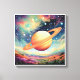 This image is an artistic and colourful depiction of a stylised Saturn. The planet, a striking blend of orange and yellow hues, dominates the centre of the frame, encircled by its prominent rings. Below the planet is a vibrant, hilly landscape painted in a rainbow of pastel colours, including pinks, purples, and blues, creating an otherworldly view. The sky above is a rich tapestry of deep blue and purple, dotted with twinkling stars and distant planets, adding to the magical atmosphere. The overall style is reminiscent of a dreamlike, psychedelic painting, with soft, flowing lines and a bold colour palette.