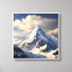 This image shows a grand, snow-covered mountain peak, standing tall against a dramatic sky. The mountain is a mix of rugged, dark rock and brilliant white snow. The warm, golden light of the sun illuminates one side, creating striking highlights and shadows that emphasise the mountain's sharp, natural form.