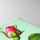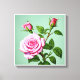 The image portrays a trio of pink roses, each in varying stages of bloom, set against a soft green backdrop. The central rose is in full bloom, its petals unfurling gracefully to reveal a delicate heart-shaped centre. Two smaller buds flank the central rose, adding a sense of dynamism to the composition. The roses are rendered with exquisite detail, capturing the subtle variations in colour and texture of the petals. The lush green leaves and stems provide a vibrant contrast to the soft pink of the roses, while the muted green background allows the flowers to take centre stage.