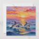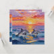 An ai impasto style dolphins swimming with a pink, orange and purple sunset over the ocean . A beautiful coastal blank card write a note to a friend or family member.