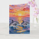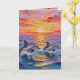 A pretty birthday card with impasto style dolphins swimming with a pink, orange and purple sunset over the ocean on the front and a nice birthday poem on the inside wishing someone a peaceful day.