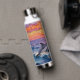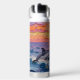 An ai impasto style dolphins swimming with a pink, orange and purple sunset over the ocean . A beautiful coastal water bottle to add a beachy touch to your drinkware.