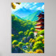 Tranquil art featuring a Chinese palace surrounded by mountains and nature.