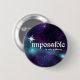 "Impossible is only a theory" round button with white text on a cosmic star field.