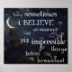 The Alice in Wonderland Through the Looking Glass quotation "Why sometimes I believe as many as six impossible things before breakfast" in great fonts along with a bright crescent moon on a string and wishful dandelions appear on a background of deep blue starry space to make a magical design.