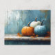 A cosy autumn-inspired impressionist painting featuring three pumpkins, orange, white, and blue, resting on a weathered wooden table. Warm fall leaves and textured brushwork enhance its rustic farmhouse charm.