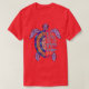 I give wanted to give this a 4 instead of a 5 because these Basic DARK T0shirts run unexpectedly SLIM or Narrow. Which is great if you do not have a potbelly, but I have a paunch. It isn't the shirt's fault that I've got a beer belly. The design and shirt itself is a quality cotton shirt. The color is more of a deep purple, but still a very pretty color. The Basic DARK T-shirts run a bit SLIMMER than the Basic Ts. The neck is a fraction narrower (or seems to be narrower) also. I'm a paunchy middle-aged woman and my neck is 12 inches (31cm) thick and the neckline fell about the same as in the photo of the man, and I had the desire to tug it a bit. So if you're a thick necked man or like loose shirts, be aware these are slimmer shirts. Once I get rid of my lockdown paunch it'll look great. The shirt washed well in cold water with no apparent bleeding. We don't have a dryer, so it hung dry. Did not shrink. Love the colors and the design. The design looks smaller on my shirt than it does on the model on-line. But still, it looks good on the shirt. The printing looks as it does on the model, just the size seems fractionally smaller. Washed garment in cold water, hung dry and design appeared unaffected.
