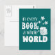 This design reads 'In Every Book A Whole World' and is accompanied by a pile of books with flowers growing from it. It's a beautiful design, perfect for people who love to lose themselves in a good book. A good quality postcard, this is also a great way to tell people about new book events, book clubs and book launches.