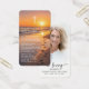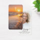 This funeral sympathy photo prayer card features a peaceful beach sunset with footprints along a tranquil shoreline, symbolizing a gentle journey of faith and rest, paired with a white cross and a heartfelt original Christian memorial poem offering comfort and hope in Christ. The other side displays the sentiment "In Loving Memory" below a cherished photo with their name and dates, creating a meaningful keepsake for a funeral, memorial service, visitation, wake or celebration of life event. Its small and portable size (3.5x2") makes this keepsake card convenient to carry as a reminder of your loved one's life, faith and spirit. Personalization makes these cards unique.