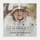 Personalized memorial christmas ornament featuring a treasured photo of your loved one, a simple white frosted heart overlay, the saying "in loving memory", their name, and dates.