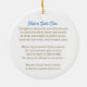 A photo Christmas ornament memorial keepsake for funerals, celebration of life gatherings or to send to friends and family in honor of someone they lost. You can add a photo in the personalized area. The accent colors used are blue and gold. On the back is a poem about your loved one being in God's arms. There is a gold cross with blue flowers on it.