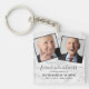 Memorial funeral tribute keychain featuring a elegant marble pattern background, 2 photos of the person who has sadly passed away, the sympathy saying "forever in our hearts", their name, and birth/death dates.
