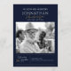 This modern funeral program design features a clean, minimalist layout with a navy blue background, elegant serif fonts, and warm gold handwritten script accents for a timeless and respectful look. A large photo is showcased alongside personalised memorial details, setting a heartfelt tone for the service. On the back, the layout includes space for the order of service, making it easy to create a meaningful and well-structured tribute. This tasteful and contemporary design offers a beautiful way to celebrate a loved one’s life with grace and dignity.