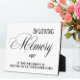 This “In Loving Memory” tabletop plaque with easel offers a heartfelt and elegant way to honor loved ones during your celebration. Its clean, timeless design creates a gentle tribute that blends beautifully with any wedding or event décor. The thoughtful message is presented with clarity and grace, bringing warmth and remembrance to your space. With its sturdy plaque and included easel, it stands securely on memory tables, guest book stations, or ceremony entrances. Its compact size makes it easy to place while still remaining visually impactful. This piece helps create a quiet moment of reflection for guests, adding emotional depth without overwhelming the setting. Designed to be both beautiful and comforting, it provides a lasting way to honor those who are missed. Ideal for any setting seeking a simple yet deeply meaningful memorial touch, it brings presence and peace to your special day.