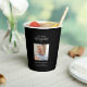Personalised funeral memorial black paper cups featuring a large picture of your lost loved one, the text in loving memory of , their name, birth/death dates, and the remembrance saying we will always carry you in our hearts. ideal for drinks and snack after the service.
