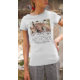 Personalized memorial tribute t-shirt featuring a treasured photo of your loved one, a simple white heart design, the saying "in loving memory", their name, and dates.