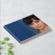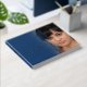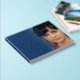 A funeral memorial tribute book. A simple in our hearts forever typographic heart script logo design in silver foil on mid blue add your own photo, name and dates. Original design by www.mylittleeden.com
