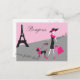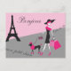 Pink grey and black. Eiffel Tower in the background. Fashionably dressed woman walking her dog and carrying shopping bags. "Bonjour" and "Oh La La" above.