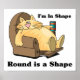 A cartoon of a fat cat lounging in his favourite chair with the words I'm in Shape, Round is a Shape surrounding it. Hey, we can't all have bodies of a God. Let the world laugh with you