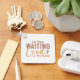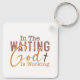 Keychain depicts simple gold and brown script on a white background. It features a cross and an inspirational Christian quote, "In the waiting, God is working."