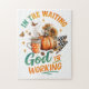 Peaceful, colourful design featuring a fall / autumn scene with a pumpkin, cup of coffee, butterflies, and fall flowers. The colourful inspirational text reads: "In the waiting God is working". This design is available on a wide variety of products.