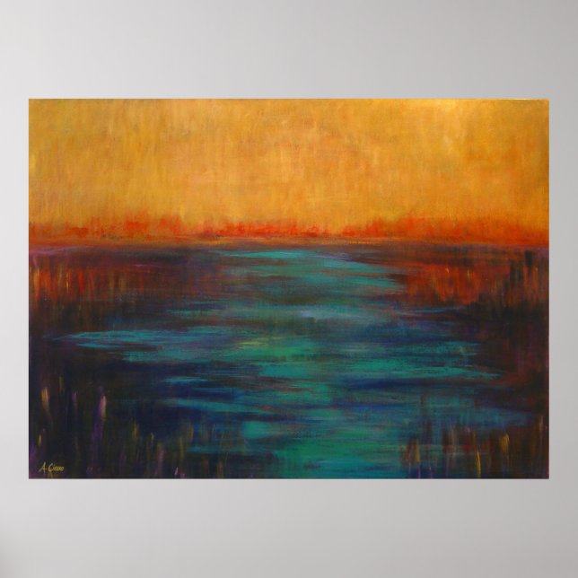 This contemporary Landscape is done in vibrant brushstrokes of blue, aqua, gold and red. A bright sunny image of a wonderful day on the coastal waterways. Great for all your friends and family that love modern decor.