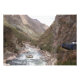 Photo print of the blue train of the Inca rail running from Cusco towards Machu Picchu through the Sacred Valley or Urubamba Valley with big mountains and Urubamba river in Peru.