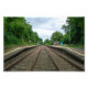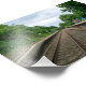 This striking photograph captures the quiet, timeless feel of Ince and Elton Railway Station in Cheshire, England. Shot from a unique, low perspective between the tracks, the image draws you in, following the two sets of rails as they converge toward the distant bridge. Flanked by lush, green trees and foliage, the platforms stand ready for a train that is just out of frame. This picture is a perfect piece for anyone who loves trains, classic British scenery, or a touch of urban landscape photography. This image can be edited and transferred to multiple products of your choosing.