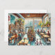 The watercolor painting beautifully illustrates an independant, community-focused café in Portland, Oregon. The interior of the café exudes a cosy, inviting atmosphere with reclaimed wood furniture and eclectic decor, including local art and communal tables. The walls are richly adorned with colourful murals and shelves brimming with books and plants, showcasing the community's dedication to sustainability and local culture. Large windows allow natural light to illuminate the bustling activity inside, where a diverse mix of patrons, from artists to entrepreneurs, engage in lively conversations or concentrate on their laptops. The exterior scene captures a vibrant street view with bicycles and local flyers, perfectly encapsulating the spirit of Portland's vibrant, community-orientated lifestyle.