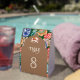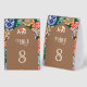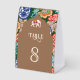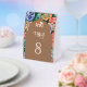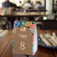 Elegant wedding table number featuring a beautiful arch and colorful artwork.