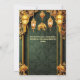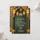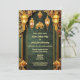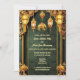 A beautiful brocade floral background in a dark forest green is edged by faux golden vertical bands and a swirl flourish arch at the top. Elegant glowing Indian lanterns hang along the top edge with a small golden elephant between them and two lotus flowers appear along the bottom edge. The brocade background has white templates on it for your custom wording. The warm tones give this design a luxurious, elegant and upmarket feel. The back has an additional template for further details to guests and family. These are ideal to celebrate Mehndi; Mehendi; Sangeet or any ethnic Asian celebration or wedding.