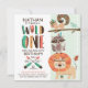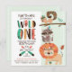 Indian Native American pow wow birthday theme with tribal lion, racoon, owl, and squirrel perched on tree branch and novelty text and arrow date.