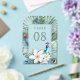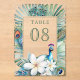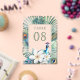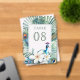 Peacock theme Indian wedding table number cards featuring a beautiful peacock, jasmine flowers and tropical leaves.
