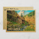 Vintage Indiana Save The Date postcard in fun retro mid-century style. It features a rustic woody nature landscape with a wood cabin and water wheel mill, and a pretty creek stream with fall leaves for an autumn or end of summer feel. This Indiana Save The Date postcard will be perfect for a country wedding or nature and camping wedding.