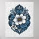 Indigo Blossom – A stunning floral composition blending rich indigo hues with crisp white blossoms, all framed within an ornate, Moorish-inspired motif. The delicate petals radiate from the centre, accented with golden stamens, while intricate botanical elements weave gracefully through the design. Set against an embossed white background, this piece exudes timeless elegance and serene beauty.