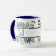 You'll love showing this pretty personalised coffee mug around the office! It features a pattern of indigo blue and green leaves and fern images making a border for your monogram at the centre. The monogram and images are placed on a white background, and repeated on the other side of the mug.