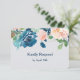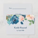 The top border on this elegant RSVP card is a bouquet image of coral peach and blue roses, with complementary soft green and blue leaves. Below the floral border is your custom text in two shades of blue. The text and image are placed on a light grey blue background. The back of the card is the same blue, with more text fields for you to customise. This card matches the wedding invitations and other wedding products by the same name in our store.