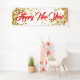 This Holiday banner is shown in the indoor style, Shown in White with Red "Happy New Year" text in a fancy script with two Gold looking swirls of stars on each end.