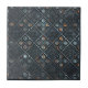 This ceramic tile features a complex, layered geometric pattern inspired by Moorish, Moroccan, or Islamic architectural motifs, rendered in a richly distressed and aged industrial metal finish in the colors of deep, dark gunmetal or oxidized iron. The design showcases a repeating lattice of intricate, interlocking octagons and diamonds, overlaid with a clean, light metallic framework that suggests forged iron or riveted metal plating. Bring unique depth and visual interest to backsplashes, accent walls, floors, and custom home projects in steampunk, industrial, bohemian, or urban-eclectic style. Search ID1227 to see other metallic geometric designs in this series. Note: design adapted from generative content.