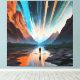A lone traveller walks among towering mountains mirrored in calm waters, while the sky bursts with cosmic beams of light. The scene blends nature and universe, inviting reflection on the inner journey and the vastness of human dreams.