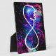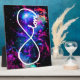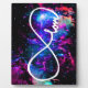 Infinity sign with the word LOVE in white. Colourful and artistic background in black, purple, pink and blue.