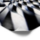 This abstract piece immerses the viewer in a hypnotic tunnel of interwoven geometric shapes, with silver and black tones creating a sense of endless depth and motion. The repeating lines suggest an infinite flow, challenging perception and inviting an immersive visual journey.