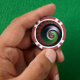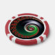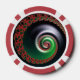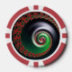 This work features a complex, swirling fractal pattern with a spiral structure that appears to extend infinitely inward. The primary colors are vivid red and lush green, contrasting against a deep, dark background. Along the spiral's path, intricate, smaller fractal shapes repeat, creating a sense of depth and movement. The red fractal elements resemble organic shapes, almost like blooming flowers or curled leaves. The green tones gradually transition to silvery whites closer to the center, adding a glowing effect. Overall, the image evokes a feeling of infinite complexity and dynamic energy.