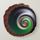 This work features a complex, swirling fractal pattern with a spiral structure that appears to extend infinitely inward. The primary colors are vivid red and lush green, contrasting against a deep, dark background. Along the spiral's path, intricate, smaller fractal shapes repeat, creating a sense of depth and movement. The red fractal elements resemble organic shapes, almost like blooming flowers or curled leaves. The green tones gradually transition to silvery whites closer to the center, adding a glowing effect. Overall, the image evokes a feeling of infinite complexity and dynamic energy.