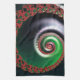 This work features a complex, swirling fractal pattern with a spiral structure that appears to extend infinitely inward. The primary colors are vivid red and lush green, contrasting against a deep, dark background. Along the spiral's path, intricate, smaller fractal shapes repeat, creating a sense of depth and movement. The red fractal elements resemble organic shapes, almost like blooming flowers or curled leaves. The green tones gradually transition to silvery whites closer to the center, adding a glowing effect. Overall, the image evokes a feeling of infinite complexity and dynamic energy.