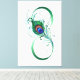 The symbol of infinity with a bright, green, artistic peacock feather on a white background. Tattoo style.
