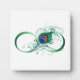 The symbol of infinity with a bright, green, artistic peacock feather on a white background. Tattoo style.