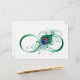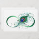 The symbol of infinity with a bright, green, artistic peacock feather on a white background. Tattoo style.