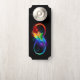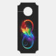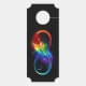 Artistically drawn infinity symbol with beautiful rainbow feather on white background. Tattoo style.